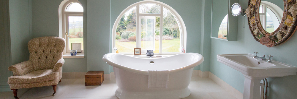 The 8 bedrooms are all individually styled, with flair and imagination; sumptuous big beds, vaulted ceilings, plenty of wardrobe space, and those views… oh, those views. The ensuites are terrific, generously sized and so smart! Snazzy palm tree wallpaper in the shower room for Bedroom 2, sophisticated florals for Bedroom 3, and the bathroom for Bedroom 1 has a rolltop bath right in front of the arched window; fill it with bubbles, lie back and gaze out over the fields; bliss.