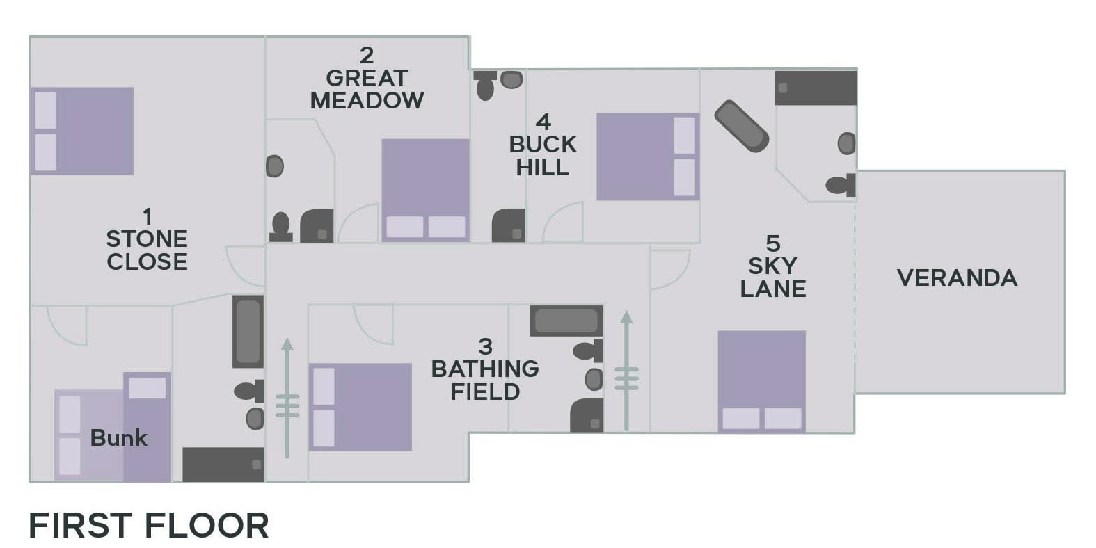 First floor suite of 2 rooms; one has zip and link beds (super king or twin), the other has bunk beds with a double on the bottom and a single on the top, so it's a great space for a family. Ensuite bathroom with spa bath and separate shower.