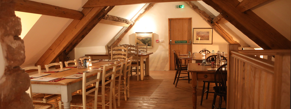 The bookworms among you may recognise the name Combe Florey as the village where Evelyn Waugh had his country home in the 1950’s. He regularly frequented the Farmers Arms with various members of the literati, and his grave is in the churchyard. Combe Florey is a pretty little village just off the A358, the main road to the Quantocks and the West Somerset coast, so if you’re planning an excursion when you’re on your large group holiday put the Farmers Arms on your agenda as a pit stop for drinks or a leisurely lunch. Otherwise go there for dinner, and if you’ve got something special to celebrate book the room upstairs where you can have your own private party – drinks and canapes, a hot or cold buffet, or a three course feast – whatever you like. It’s a great space up there, spanking brand new but the old timbers they’ve used blend seamlessly with the modern look, and it’s big enough for 50-60 people, so if you’re coming down on holiday to catch up with old friends or family for a special occasion, there’s your answer, have that room, celebrate in style.