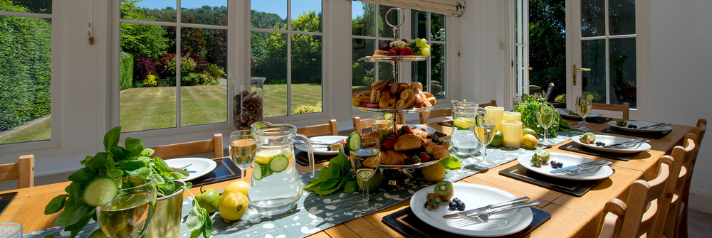 Inside, Garden Court feels so inviting. It’s got that wonderful soft ambience that you can’t quite put your finger on, but it makes you feel so relaxed, so happy to be here, and it’s got a certain cosiness, which is no mean feat to pull off for a house this size. There’s a well equipped kitchen that leads through to the dining area - such a sociable space, very well equipped, with somewhere to sit comfy and a long dining table in the orangery. Being an orangery the daylight and sunshine pours in, so when you’re all sat up ready to tuck into a scrumptious celebration feast you can look out over the garden, raise a glass and know that this moment will be etched in your memory for ever.