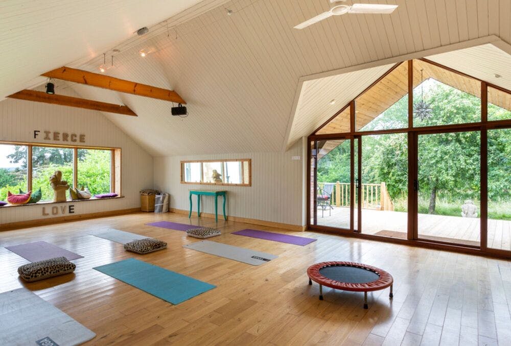 In a separate building across the courtyard at the back of the house you’ll find a laundry room, a gym with table tennis as well as the exercise gear, and up above, a games room/snooker room, and a light and airy yoga/dance studio with a decked terrace.