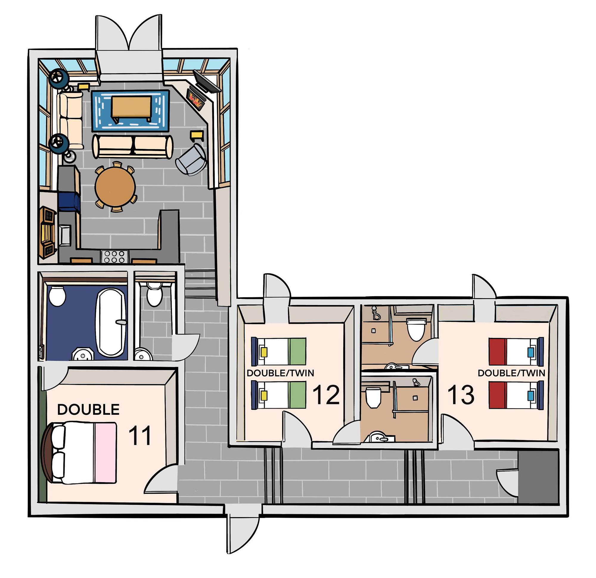 This is on the first floor of the larger barn and has zip and link beds (super king or twin) and an ensuite shower room.
