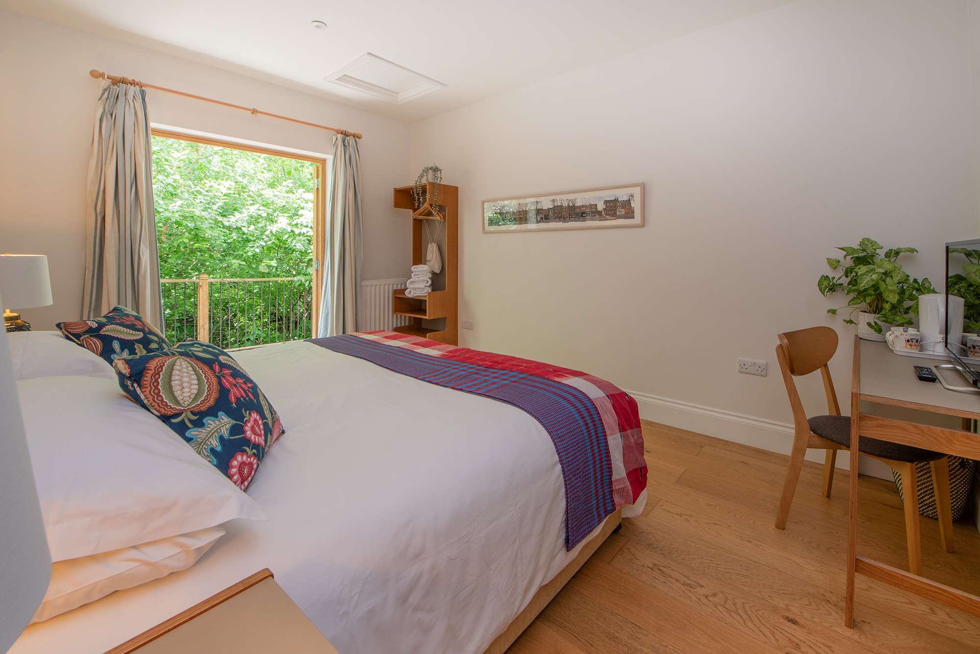On the ground floor in the pool building, zip and link beds (super king or twin), ensuite shower room