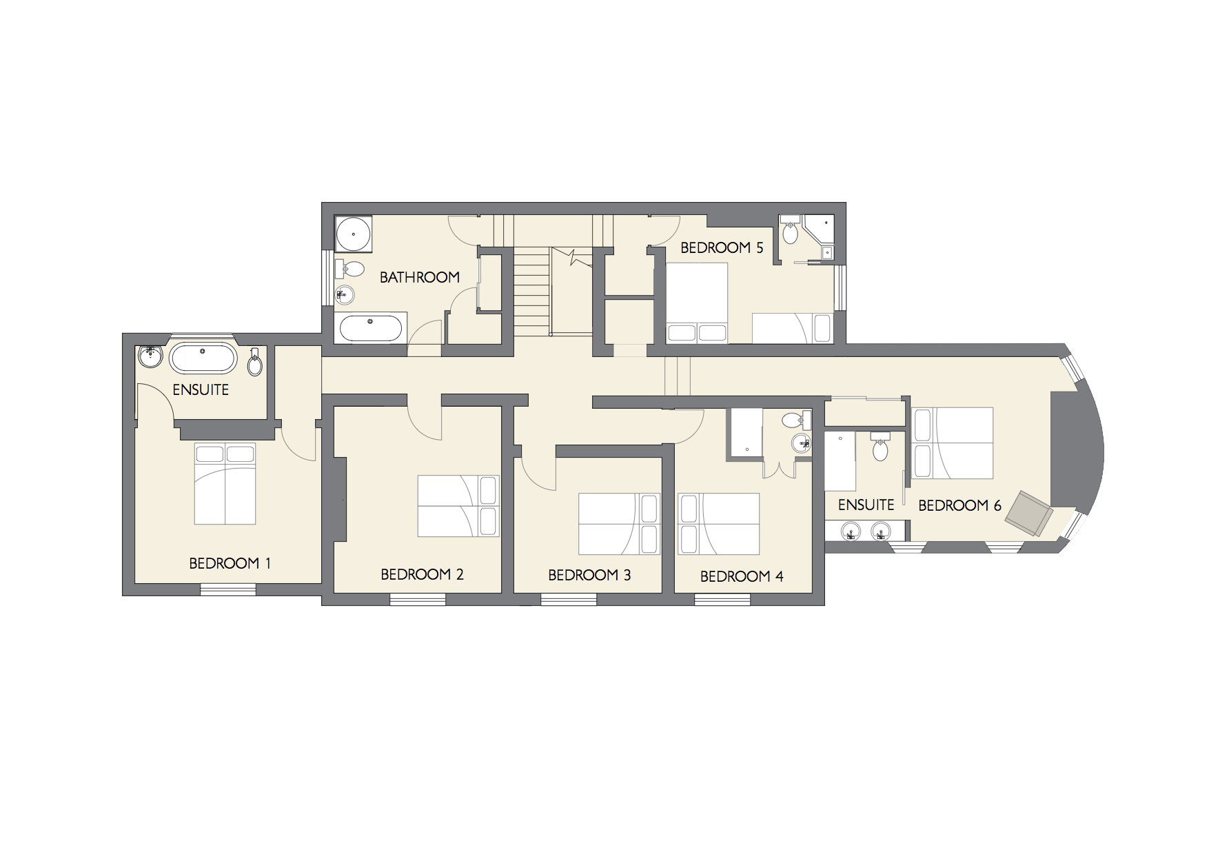 First floor, zip and link beds (super king or twin), ensuite bathroom with free standing bath and separate shower