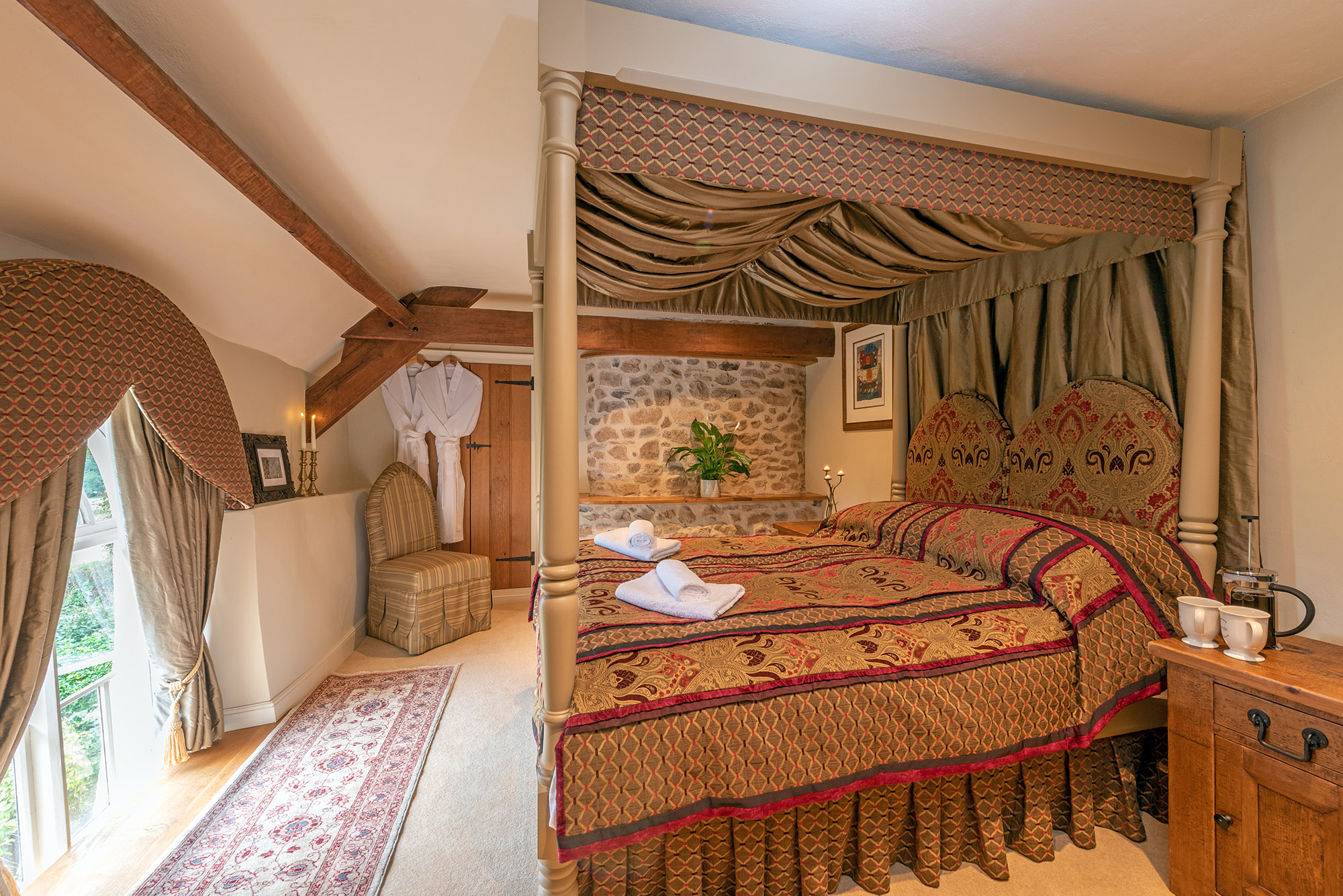 Big Thatch, Devon - Bedroom 3 has exposed stone walls and a four poster bed Bedroom 3