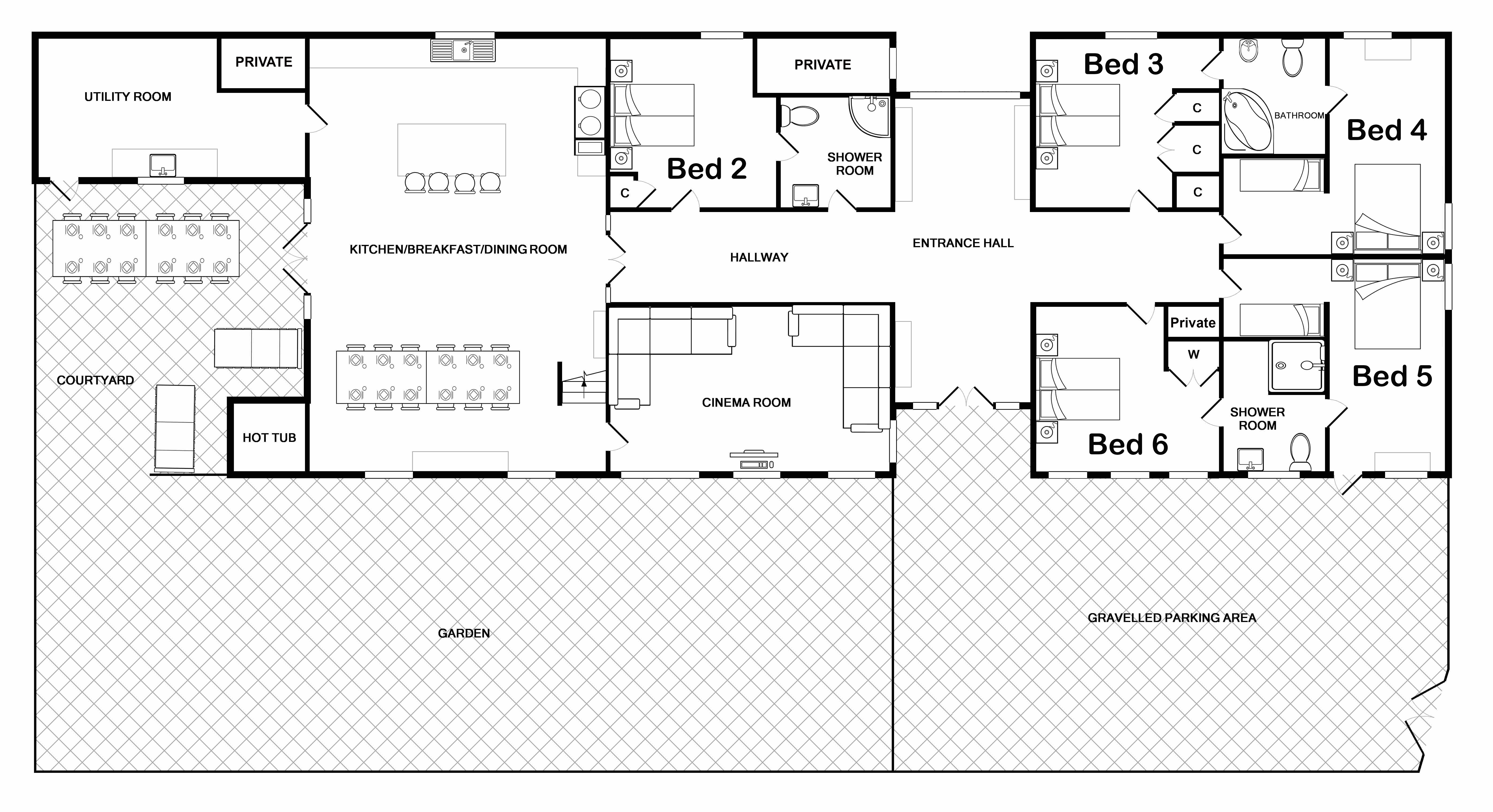 Zip and link beds and 2 singles (super king and 2 singles, 4 singles, super king only or 2 singles only), an ensuite wet room. Great for a family