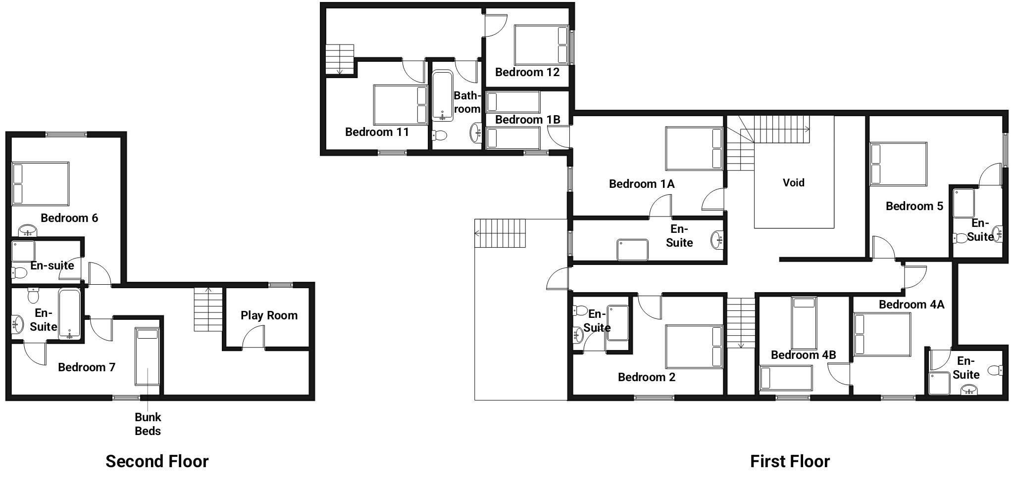 Second floor, bunk beds, ensuite bathroom with bath and overhead shower.