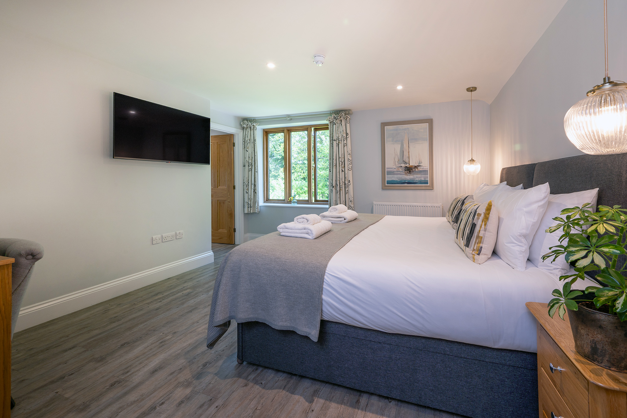 Kingshay Barton - Bedroom 4 (Coombe) has an en suite bathroom with a built-in TV -