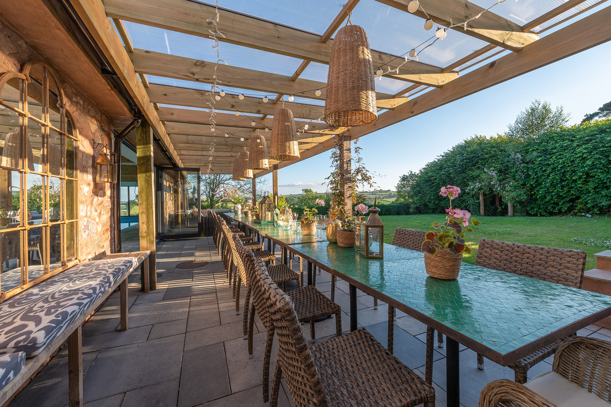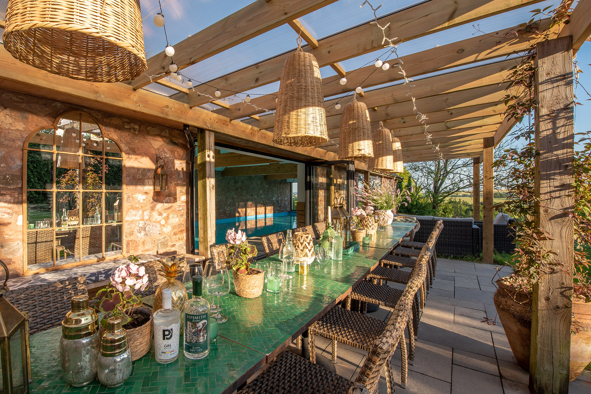 Ortensia - A stunning Moroccan tiled dining table beneath the Pool Pergola -