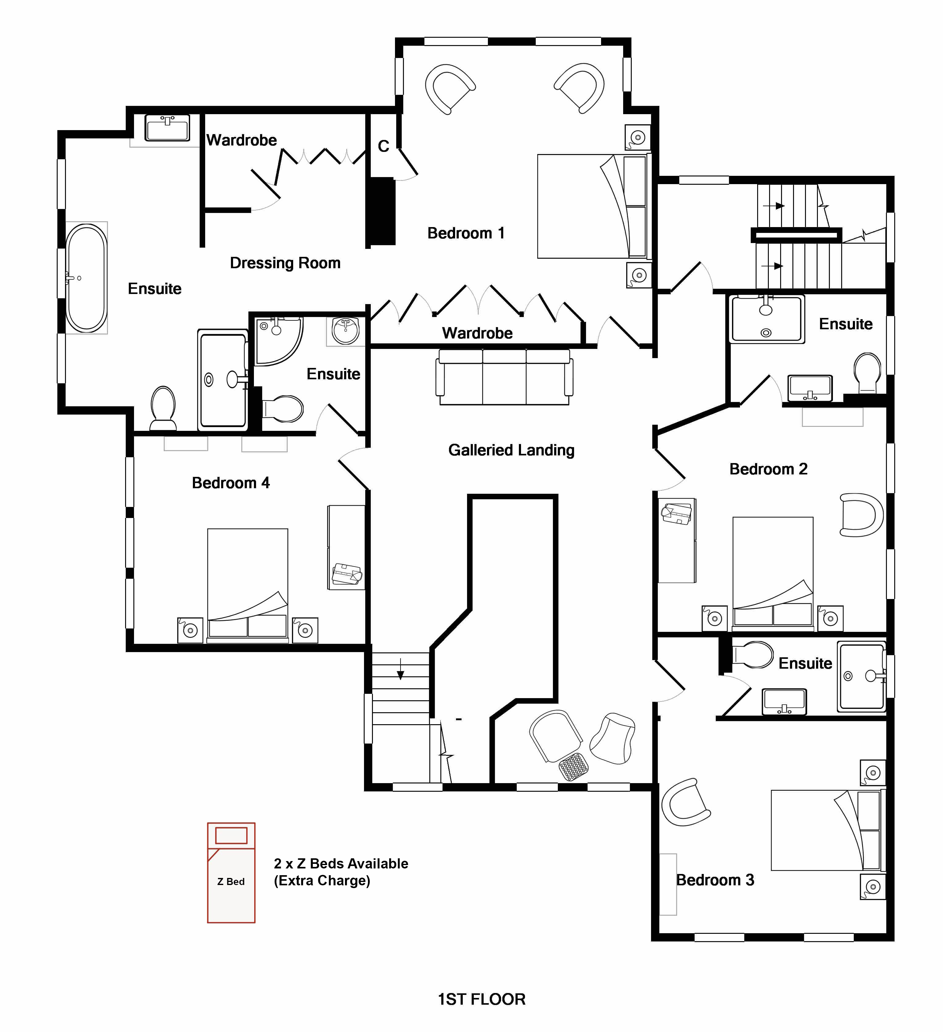 This is the master bedroom on the first floor; it has a modern four poster super king size bed, a dressing area and a bathroom with a bath and double walk-in shower.
